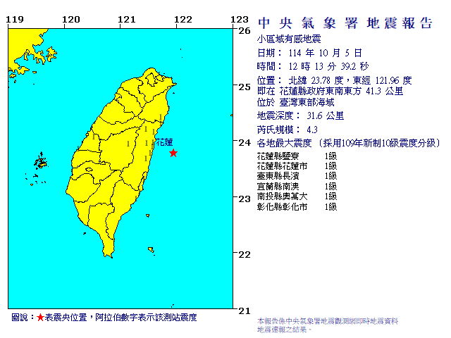 - 發震時間:2025/10/05 12:13:39