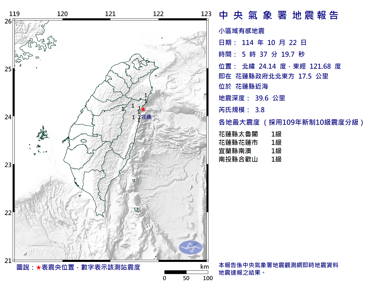 即在花蓮縣政府北北東方 17.5 公里 ,位於花蓮縣近海