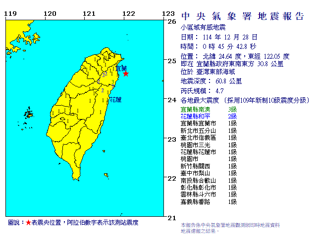 - 位置:北緯 24.64度,東經 122.05度 即在宜蘭縣政府東南東方 30.8 公里 ,位於臺灣東部海域