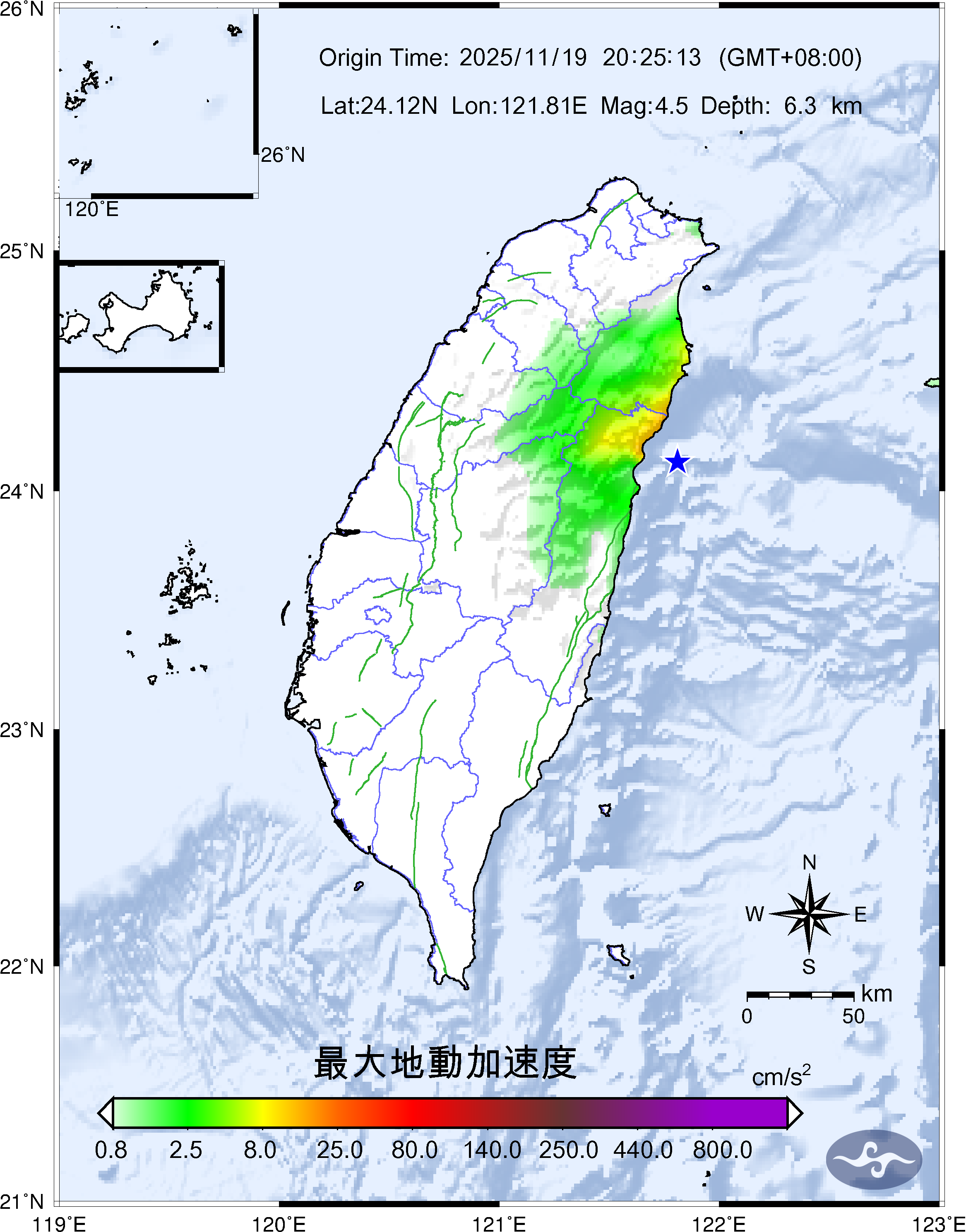 - 位置:北緯 24.12度,東經 121.81度 即在花蓮縣政府東北方 23.6 公里 ,位於臺灣東部海域