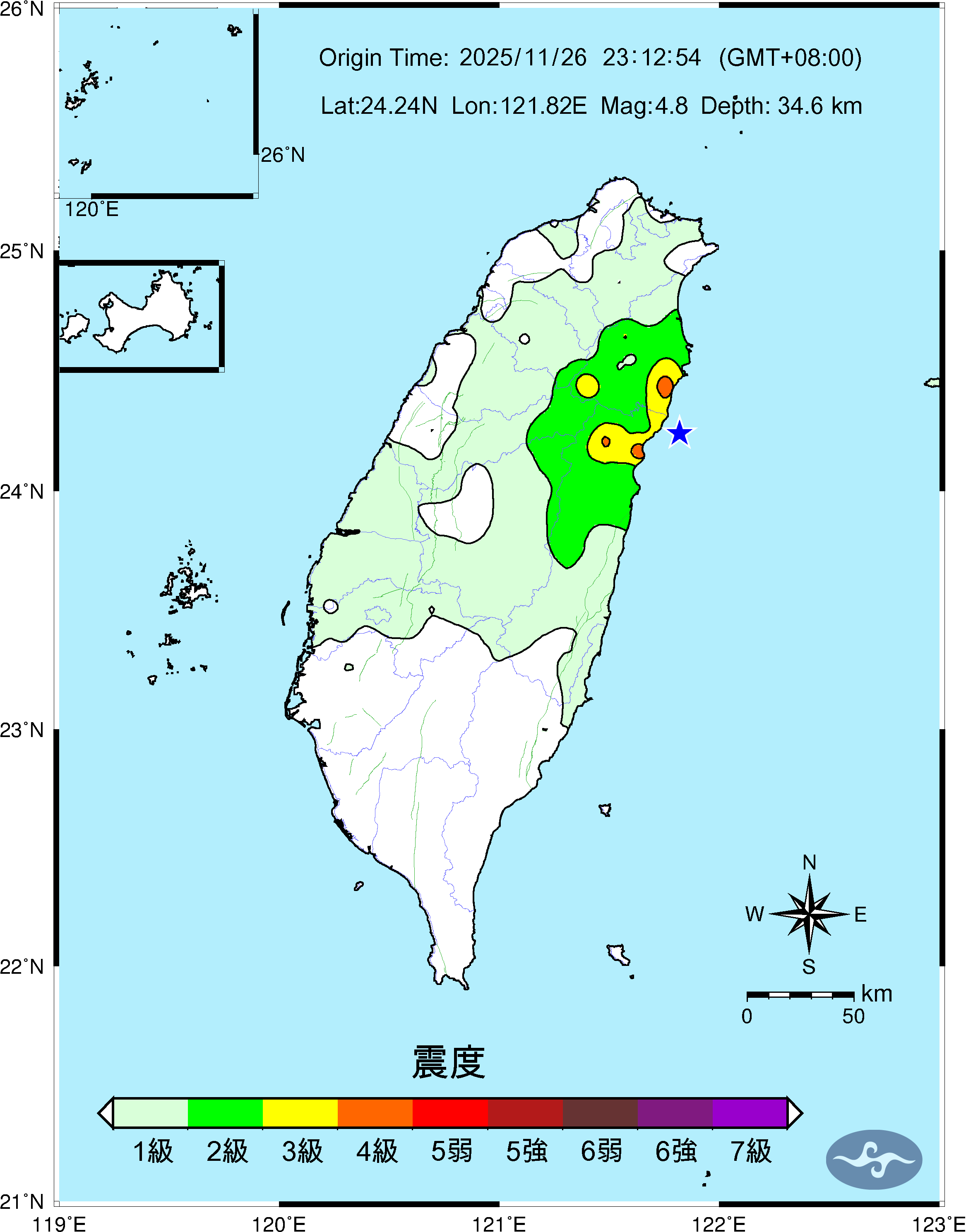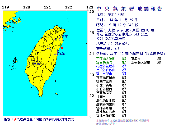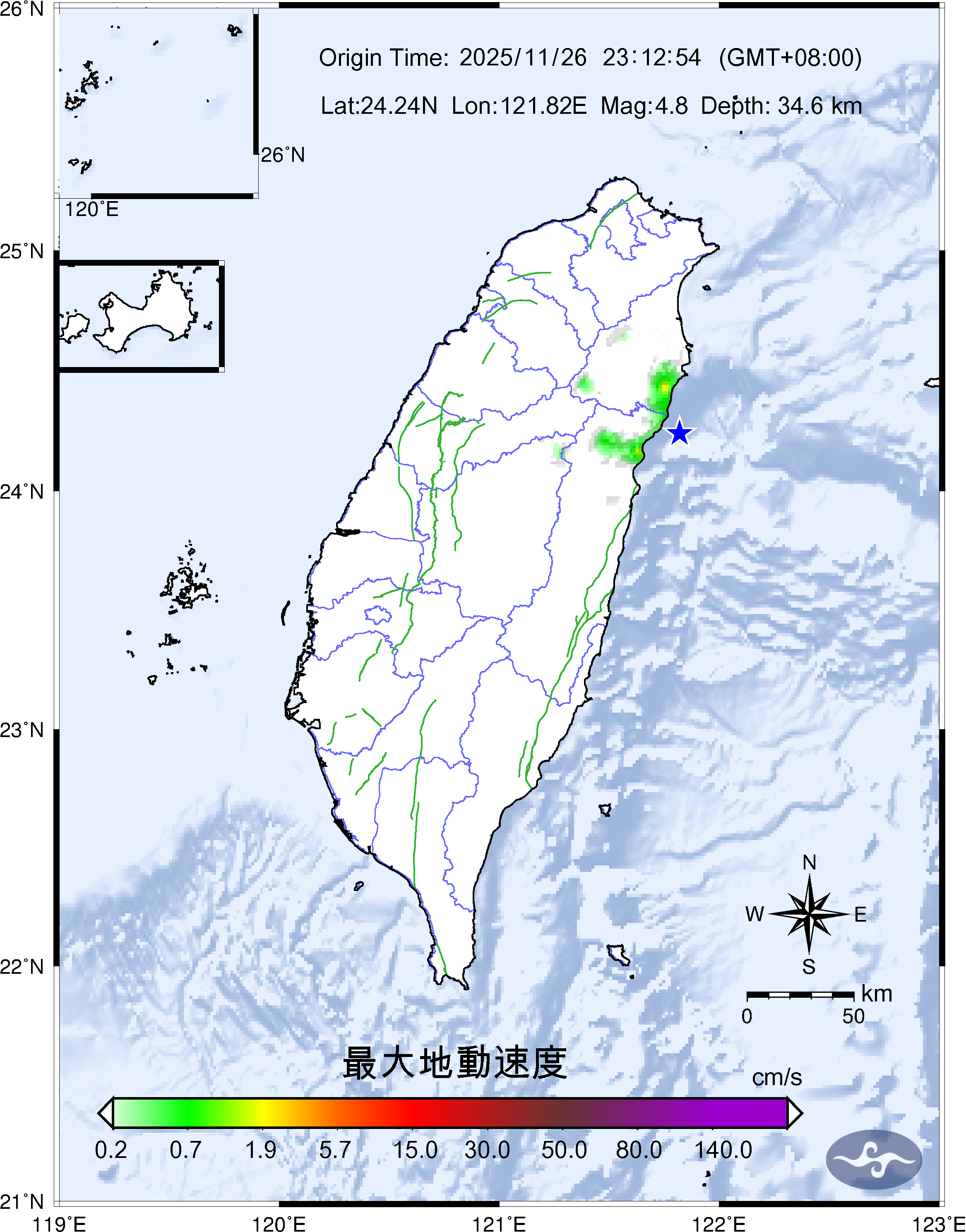 • 本報告係中央氣象署地震觀測網即時地震資料地震速報之結果。