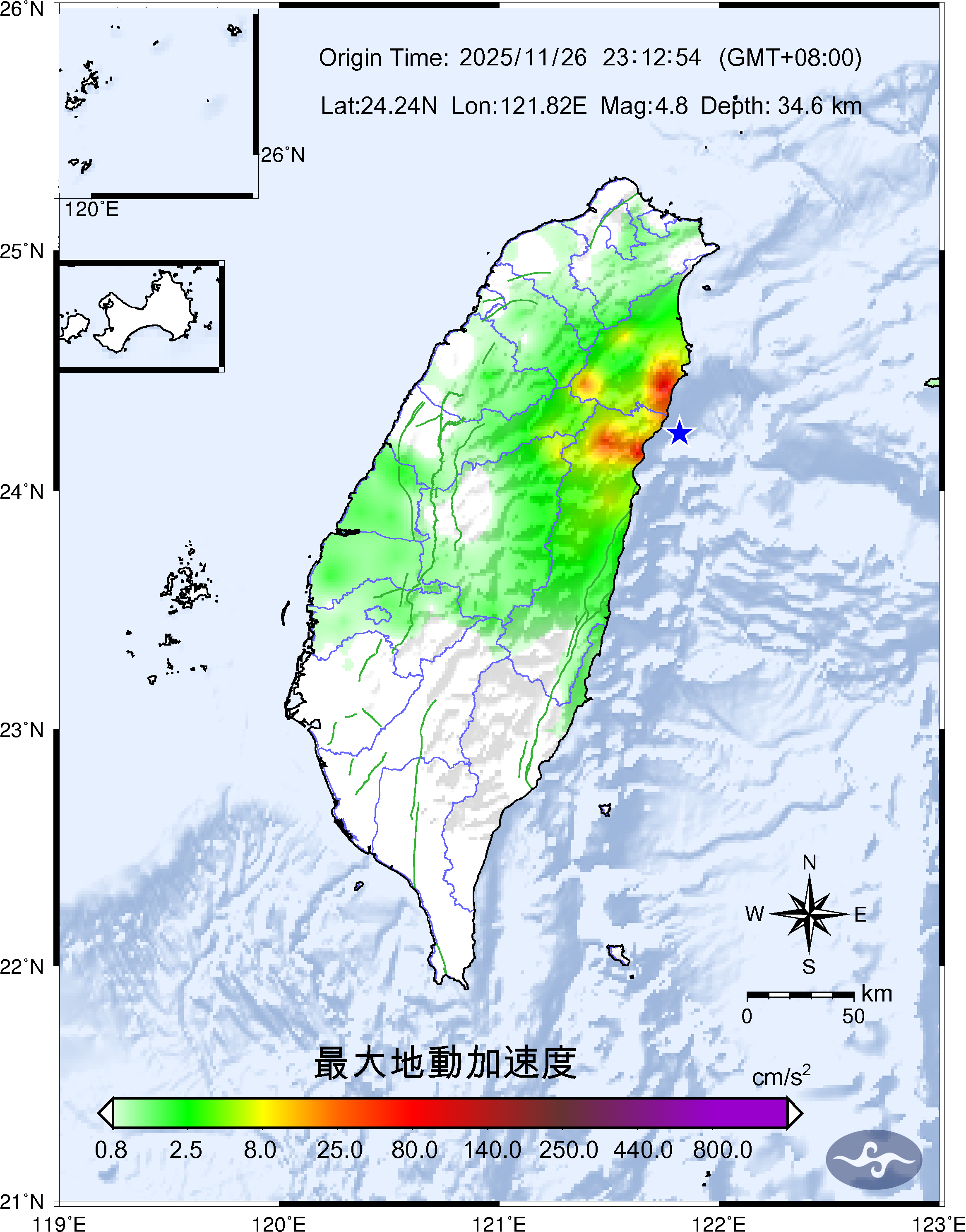 • 位置:北緯 24.24度,東經 121.82度 即在花蓮縣政府東北方 34.1 公里 ,位於臺灣東部海域