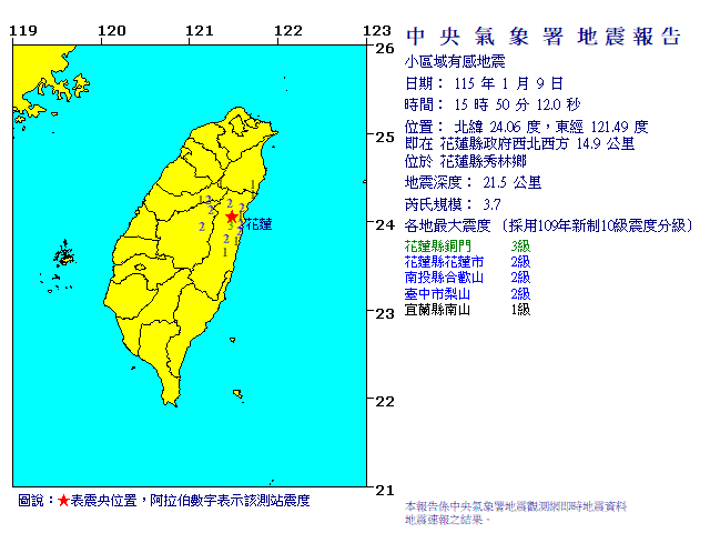 - 本報告係中央氣象署地震觀測網即時地震資料地震速報之結果。