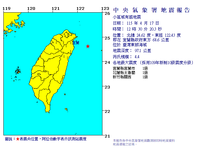 即在宜蘭縣政府東方 68.6 公里 ,位於臺灣東部海域