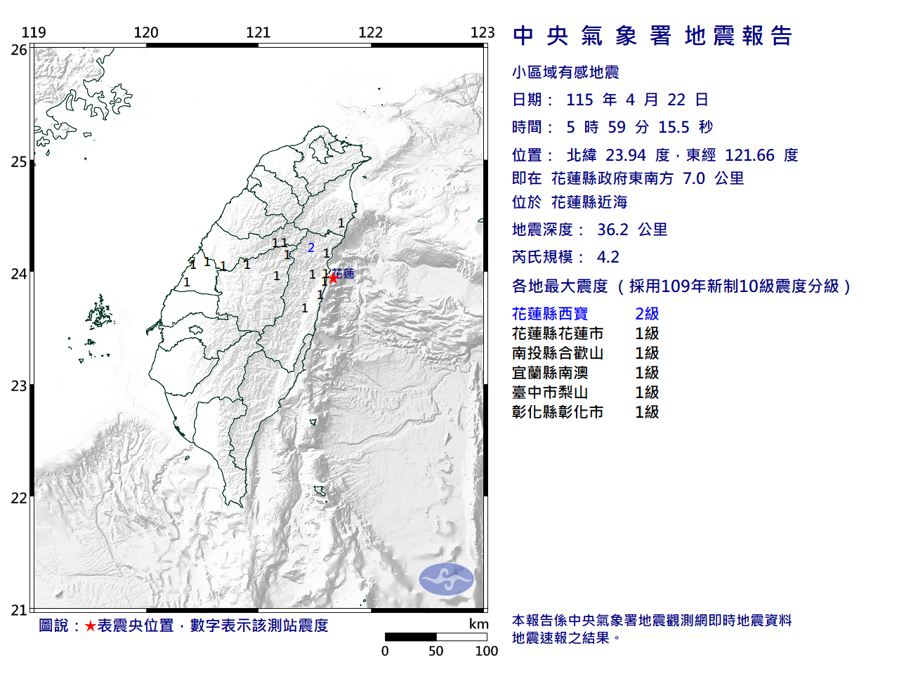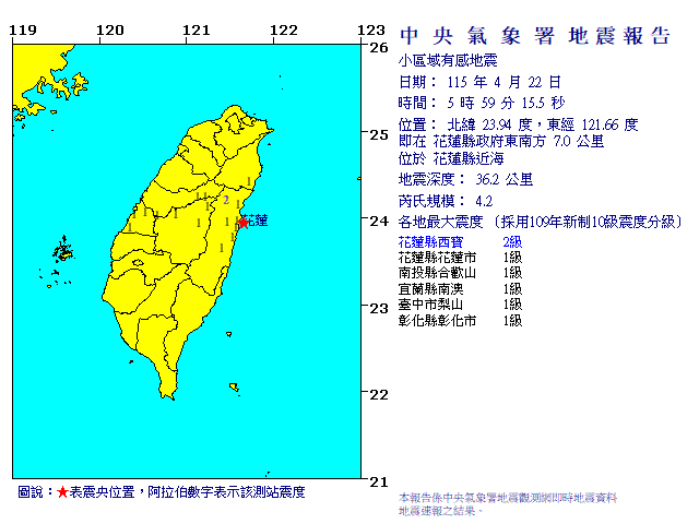 - 發震時間:2026/04/22 05:59:15