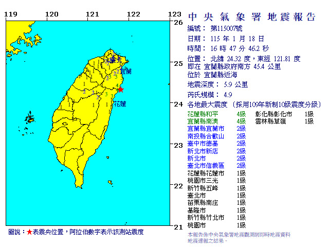 - 發震時間:2026/01/18 16:47:46