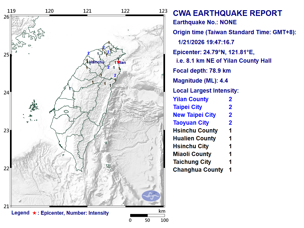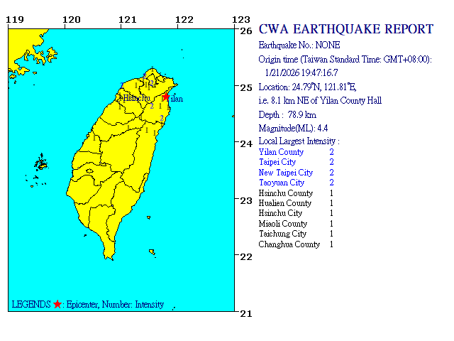 - Epicenter: 24.79°N, 121.81°E 8.1 km NE of Yilan County Hall