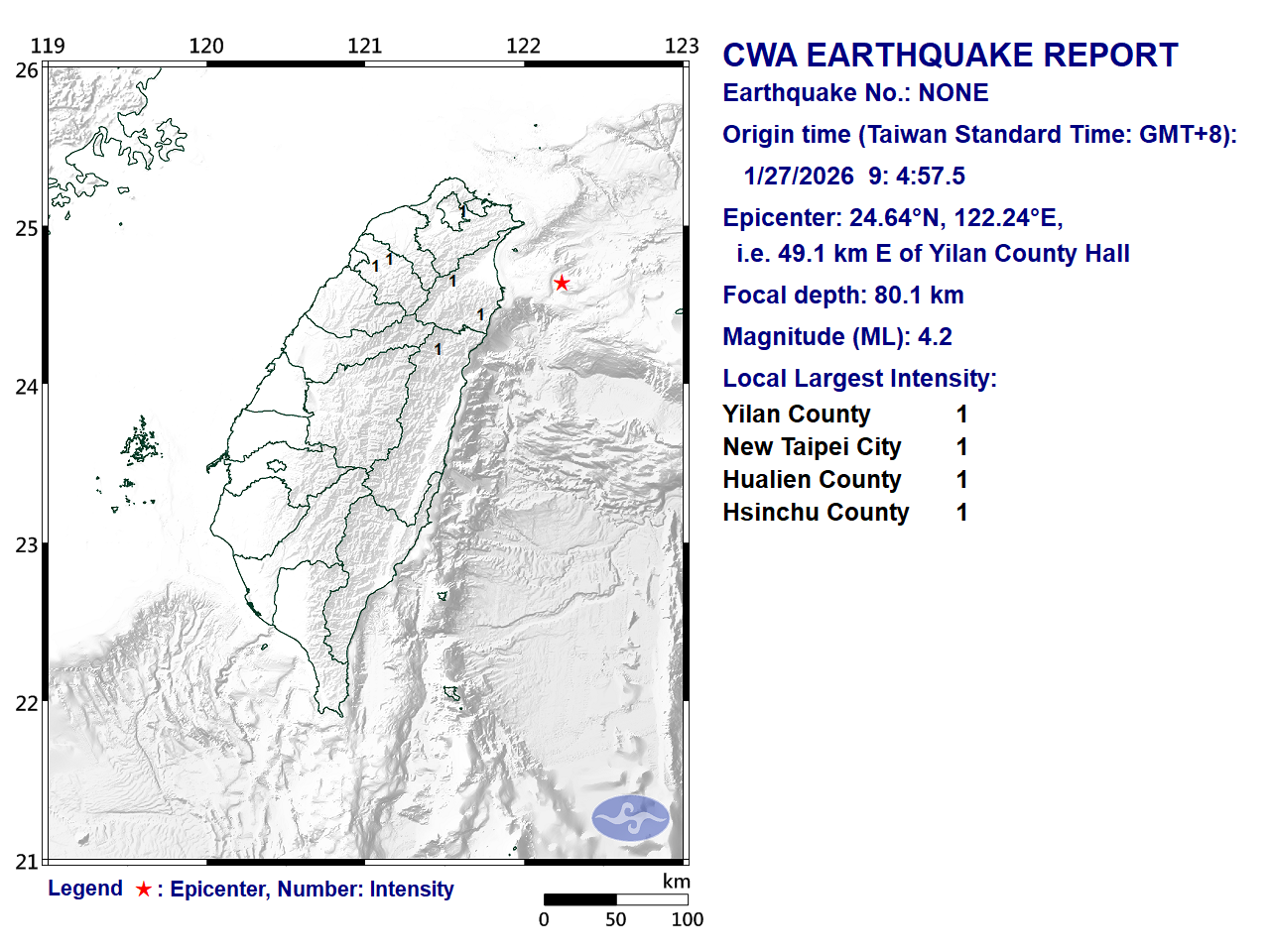 - Epicenter: 24.64°N, 122.24°E 49.1 km E of Yilan County Hall