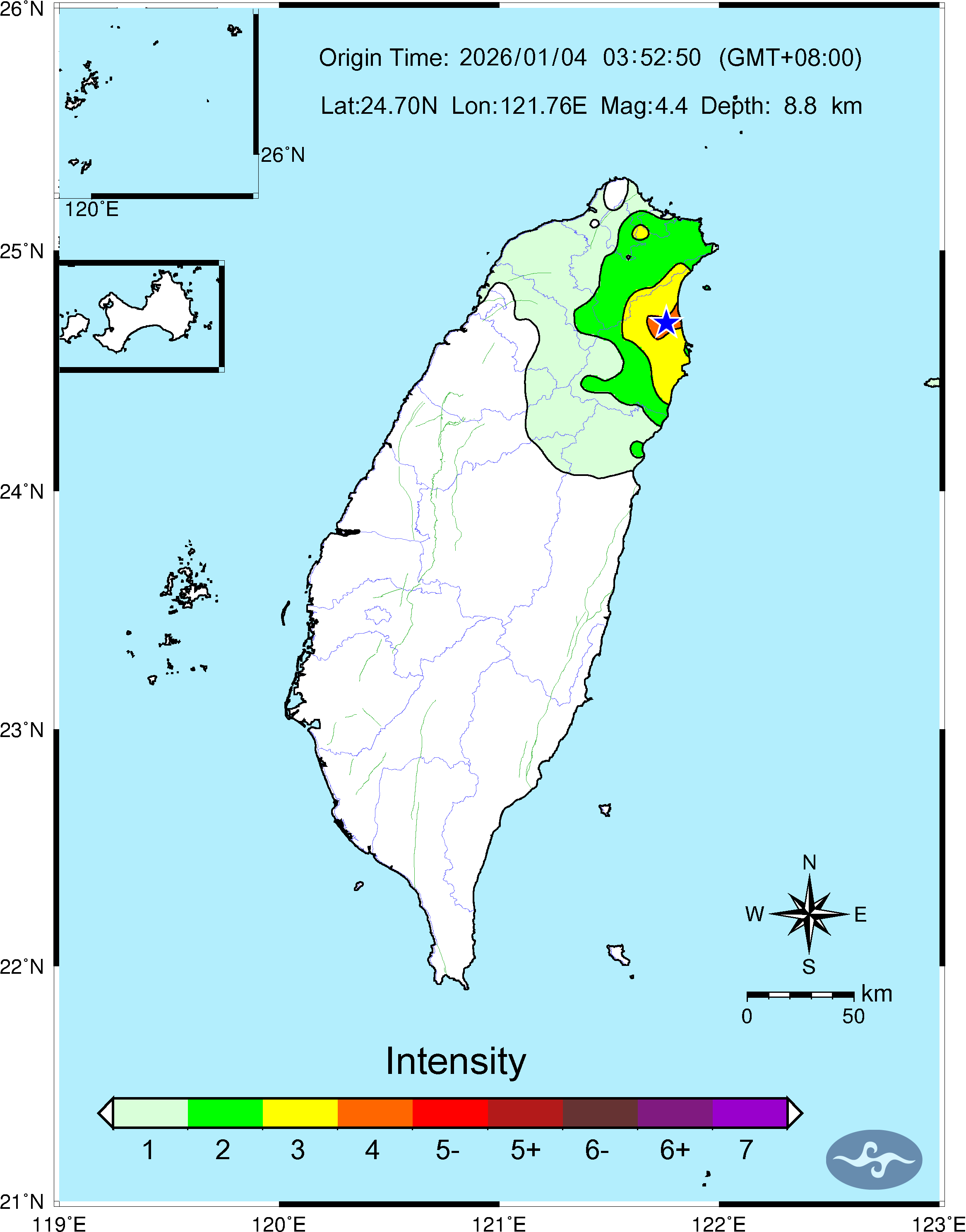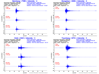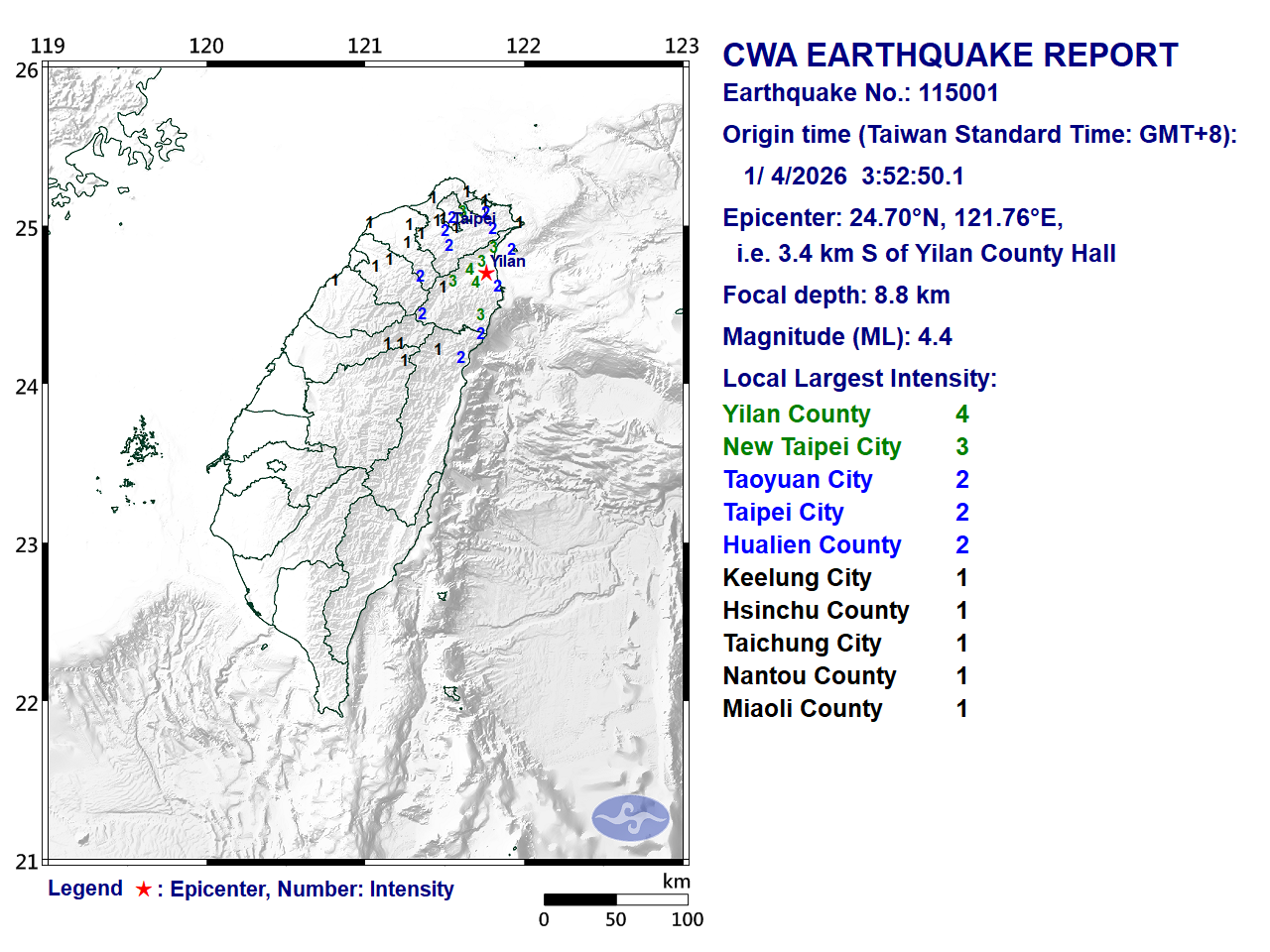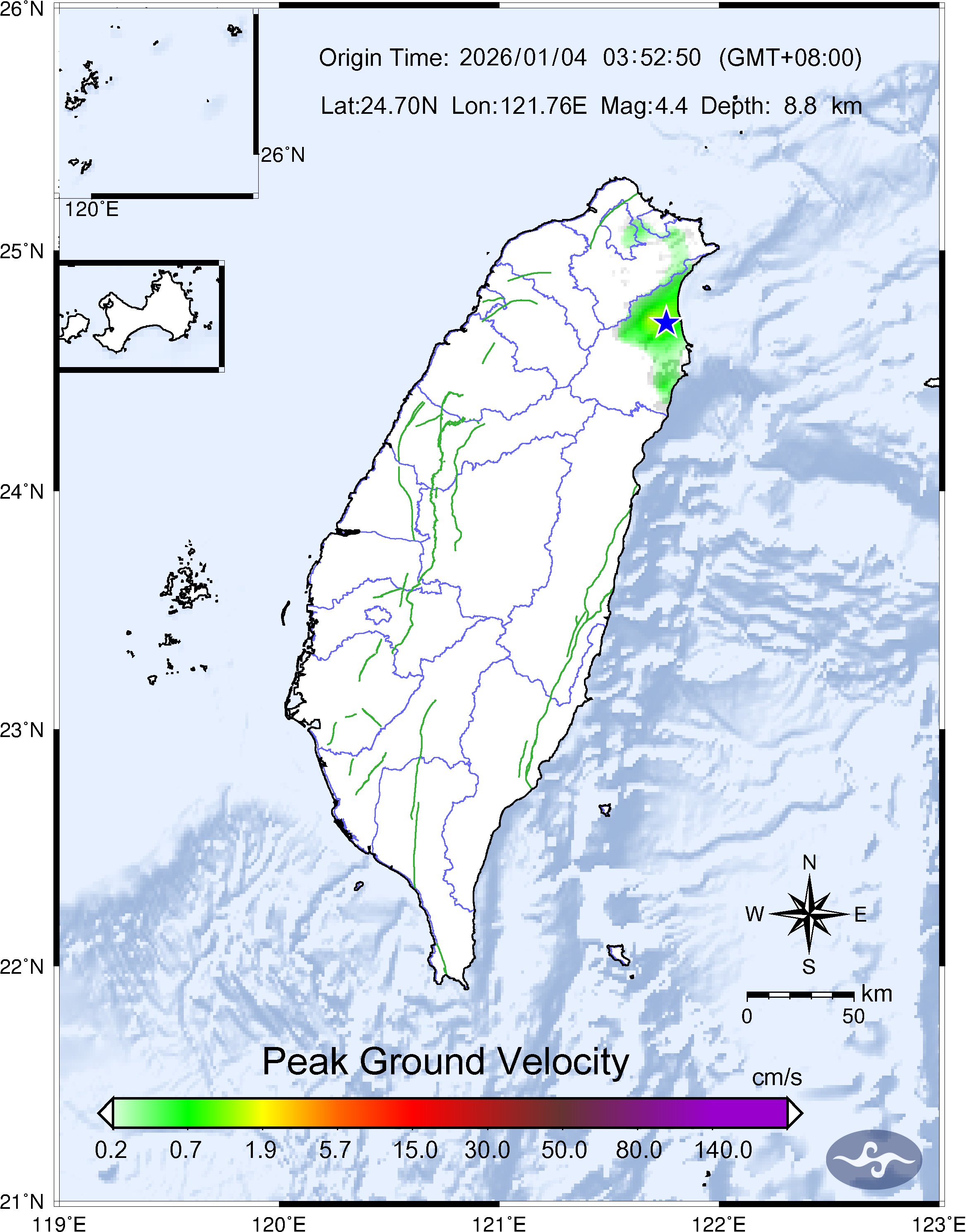- Epicenter: 24.7°N, 121.76°E 3.4 km S of Yilan County Hall