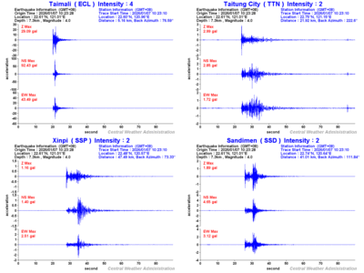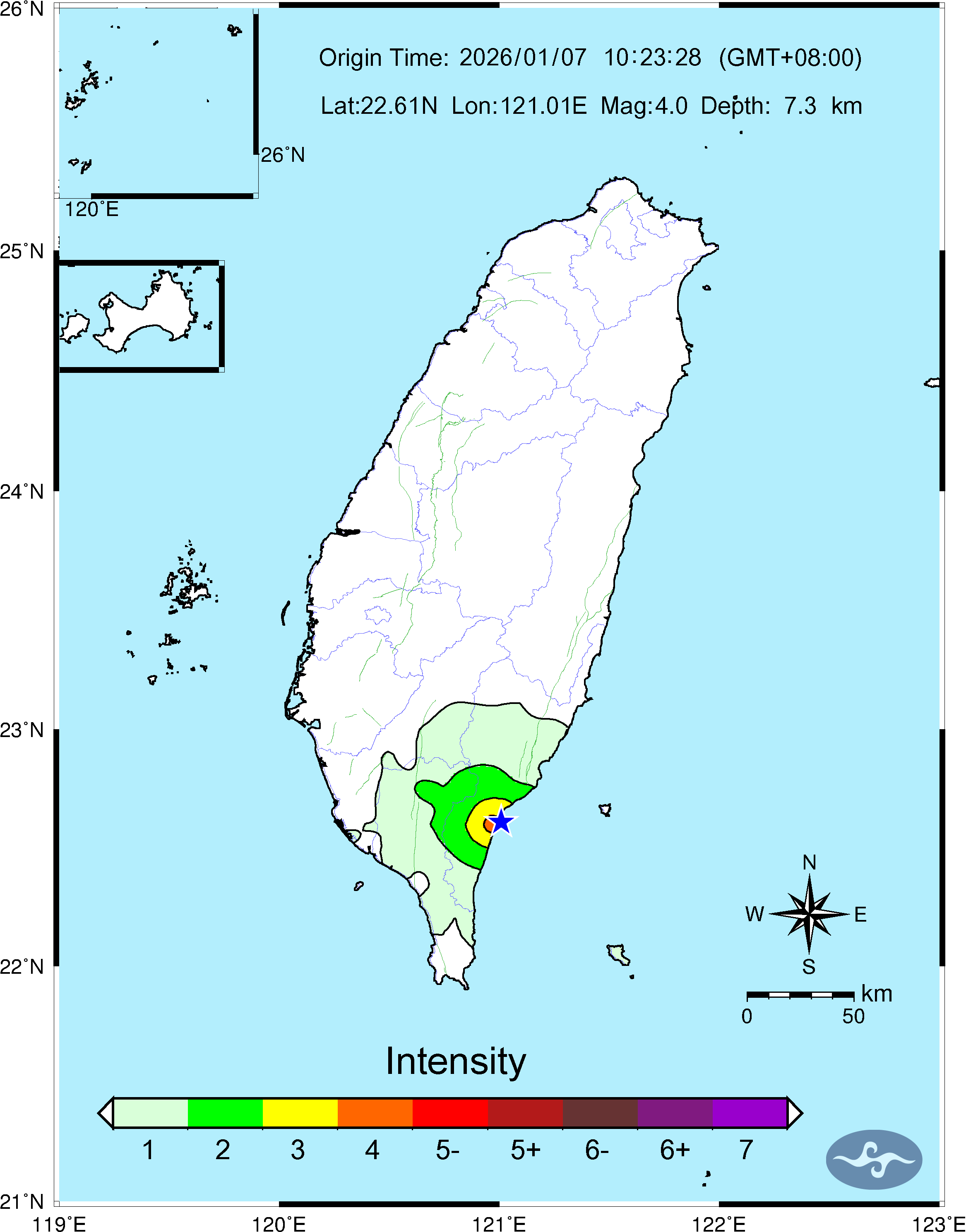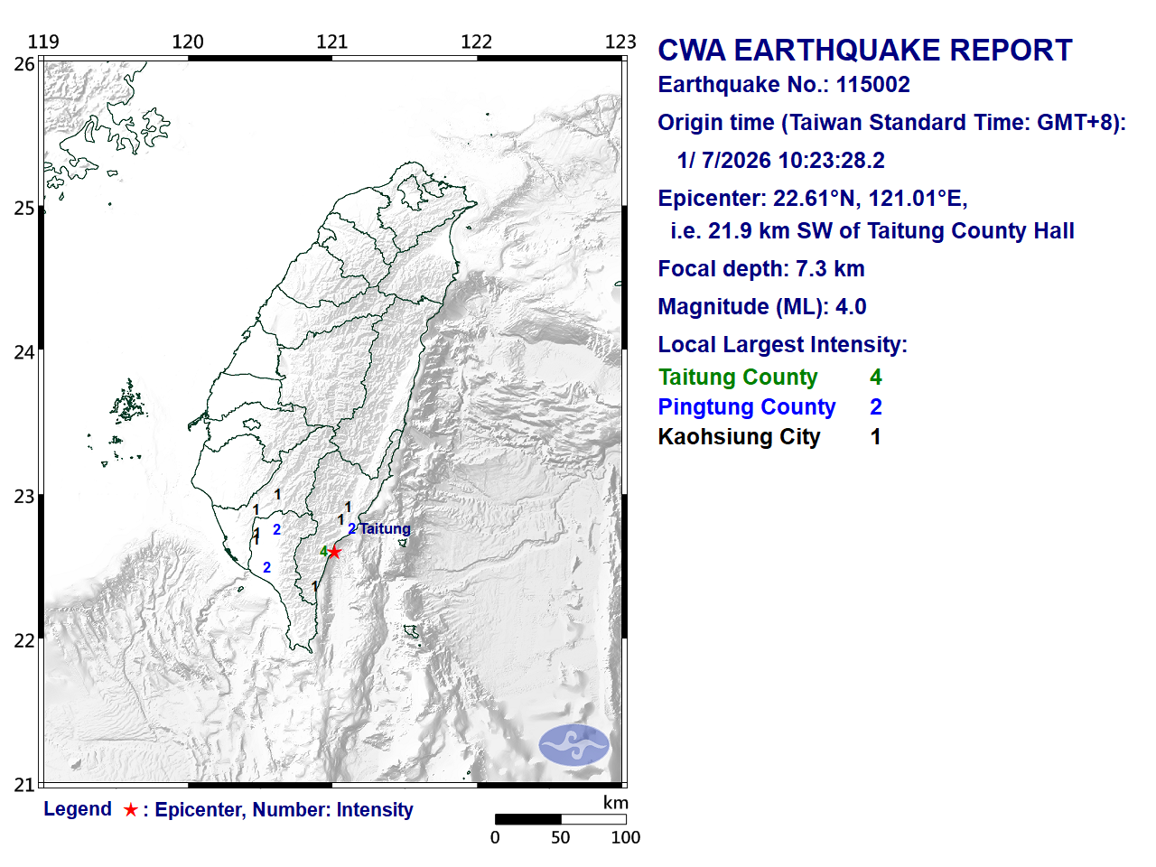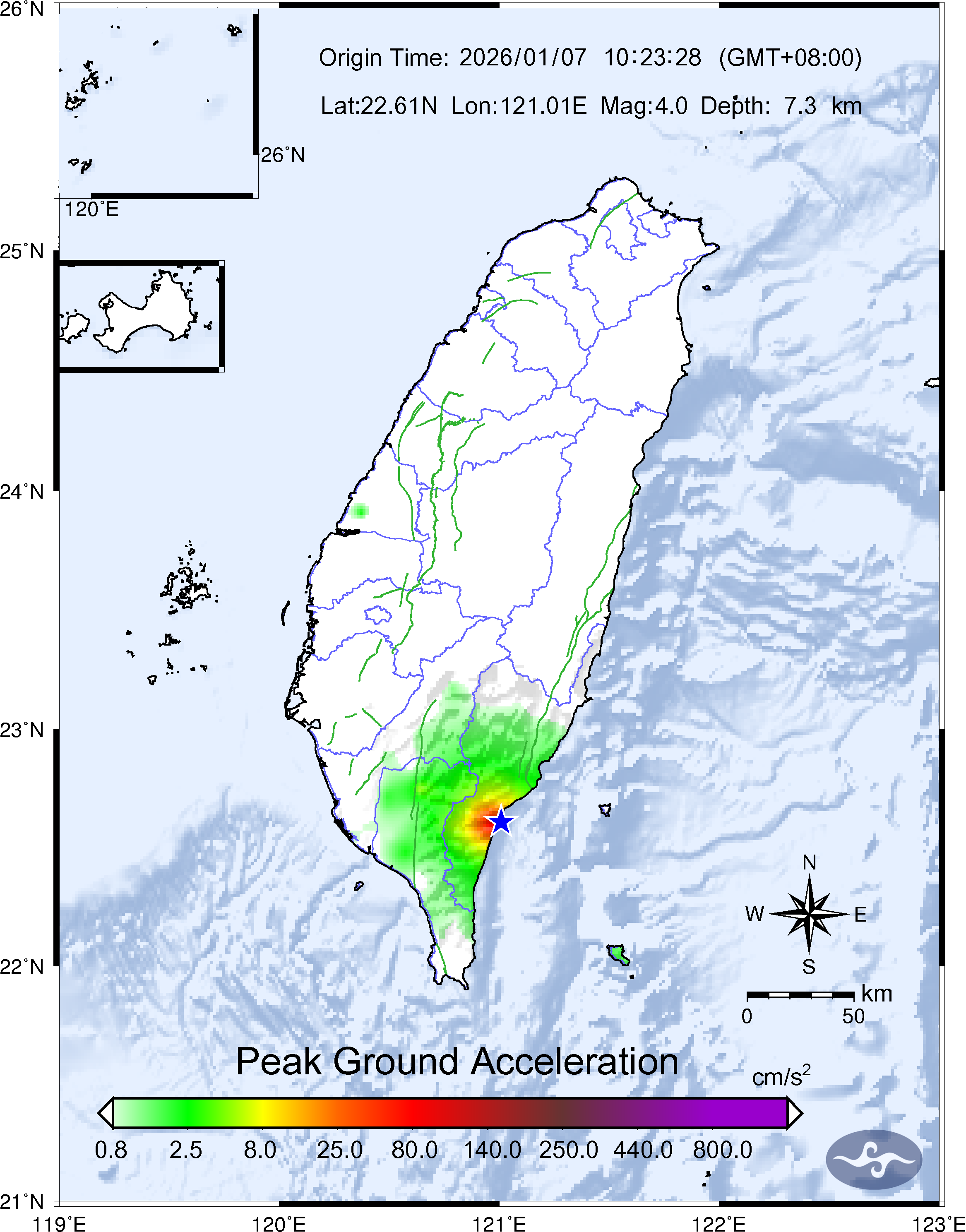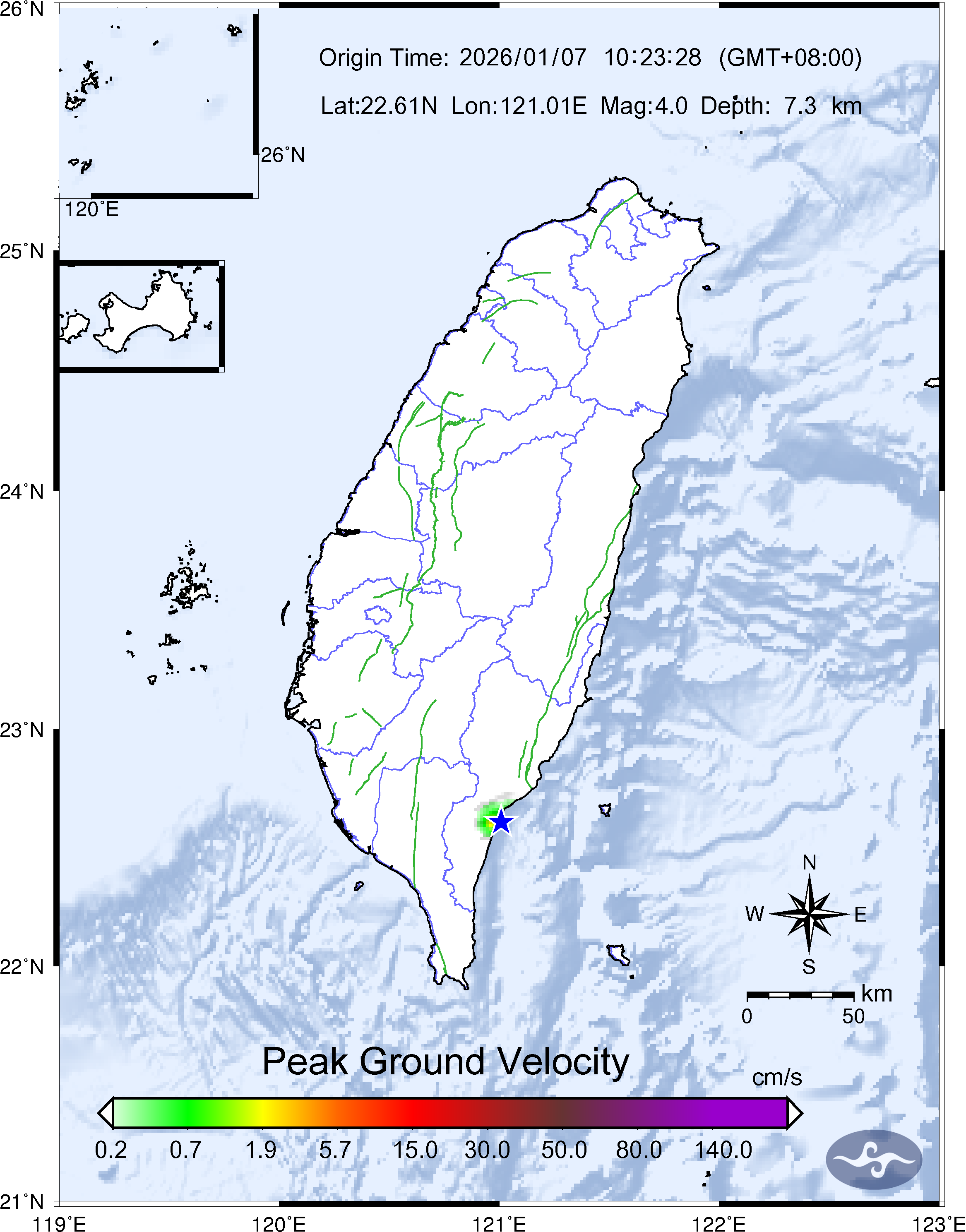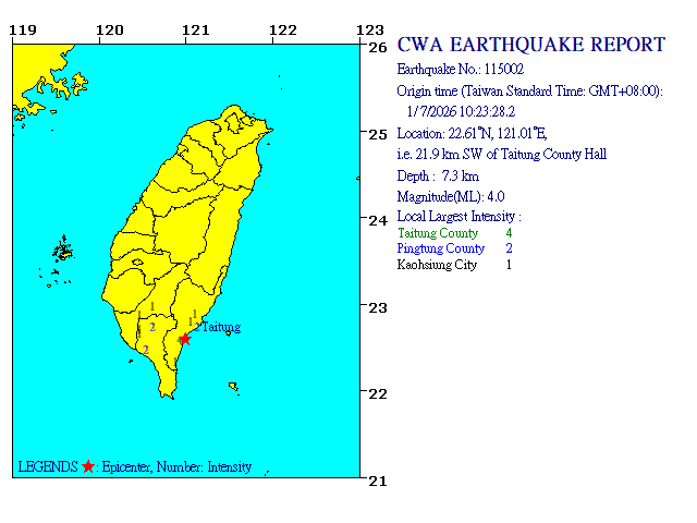 - Epicenter: 22.61°N, 121.01°E 21.9 km SW of Taitung County Hall