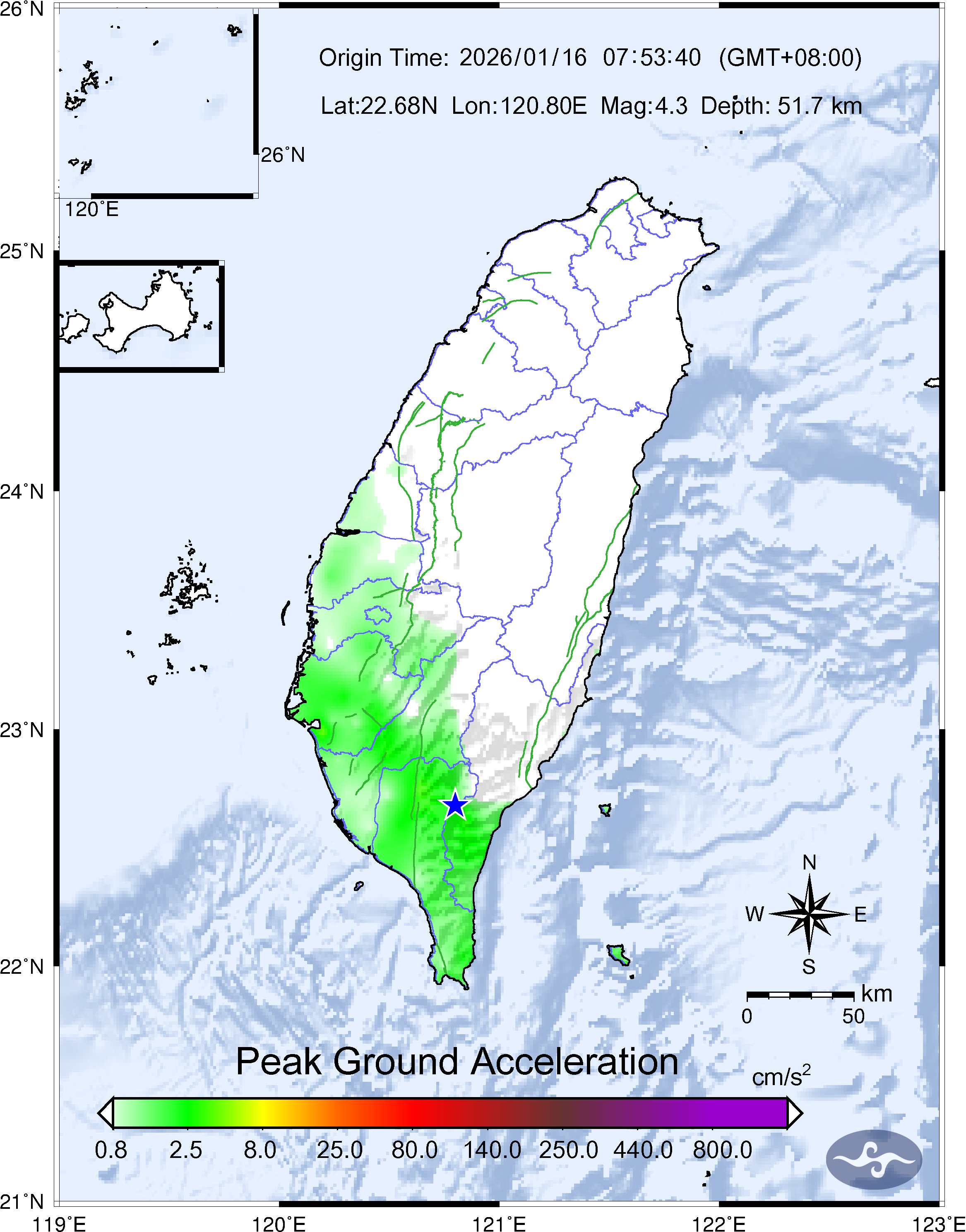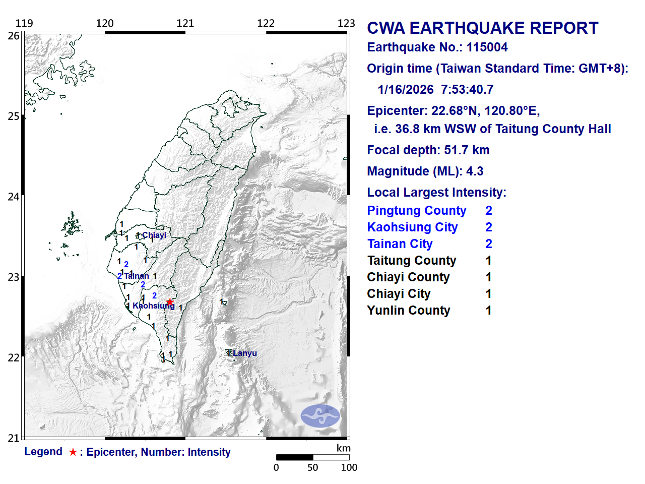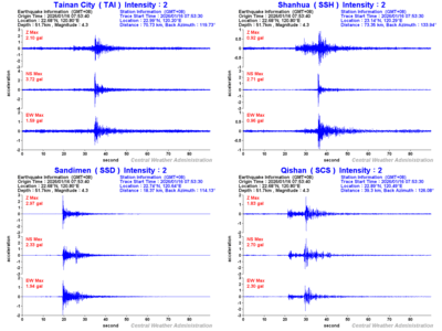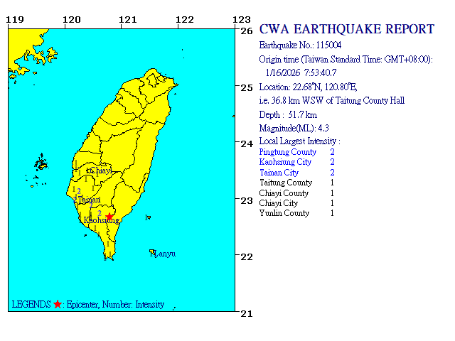 - Epicenter: 22.68°N, 120.8°E 36.8 km WSW of Taitung County Hall