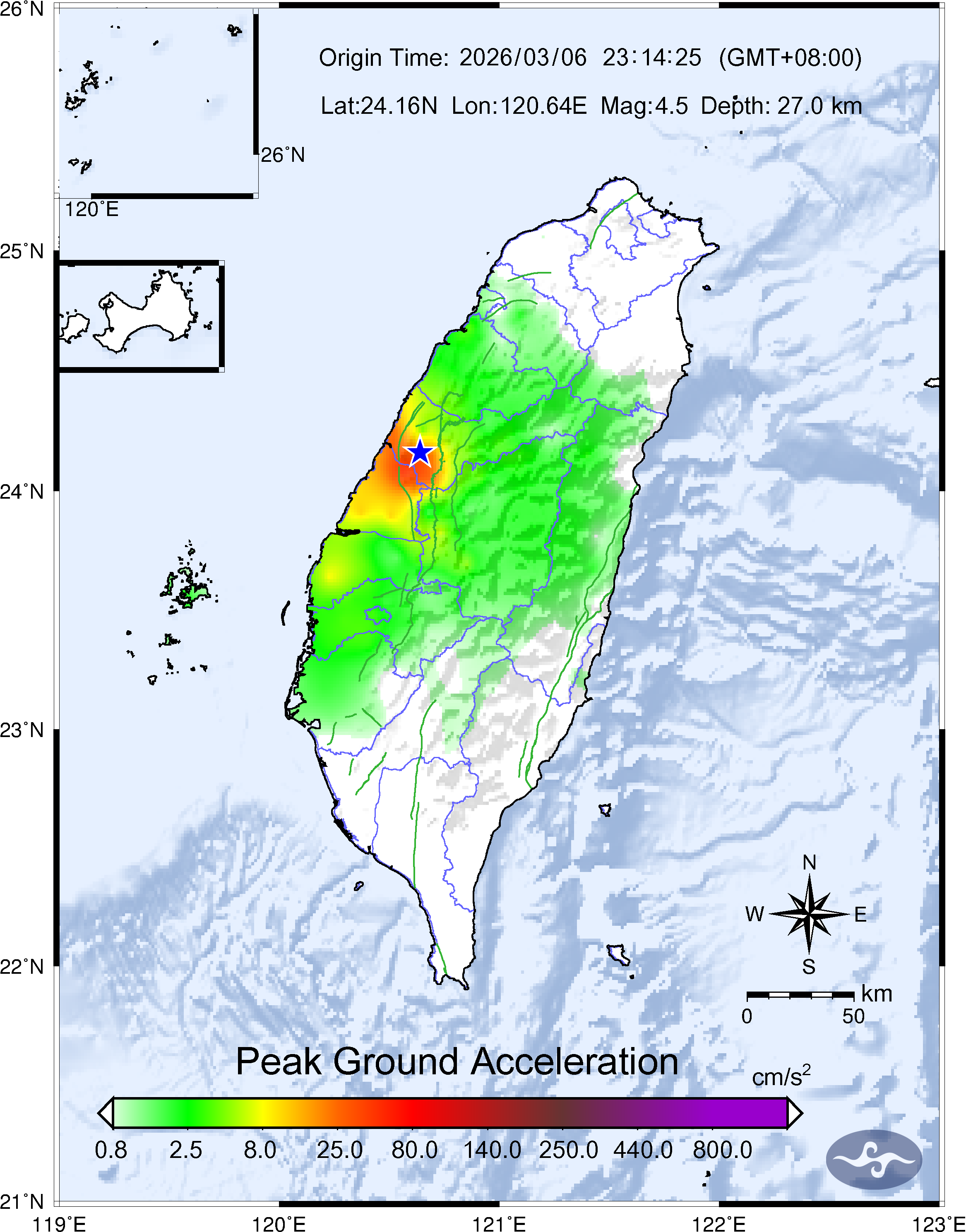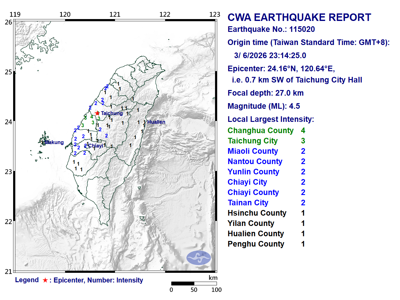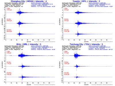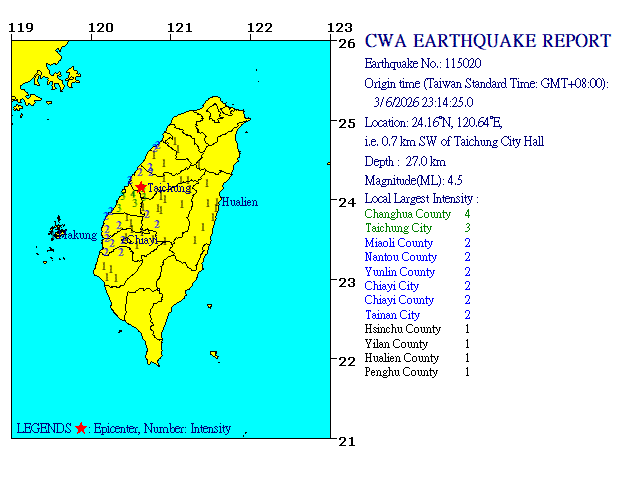 - Epicenter: 24.16°N, 120.64°E 0.7 km SW of Taichung City Hall