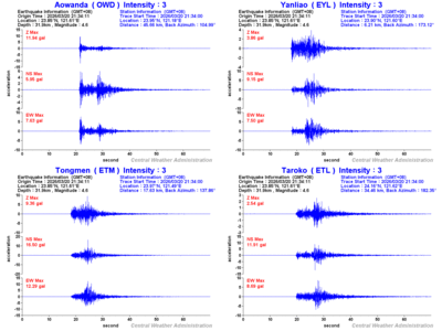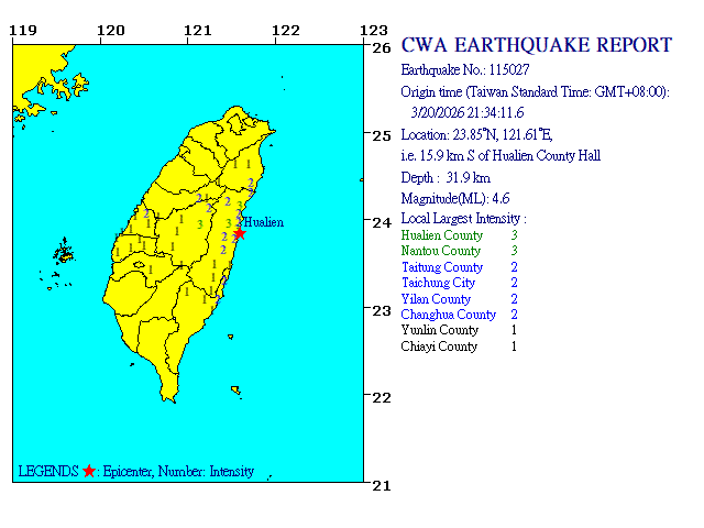 - Epicenter: 23.85°N, 121.61°E 15.9 km S of Hualien County Hall