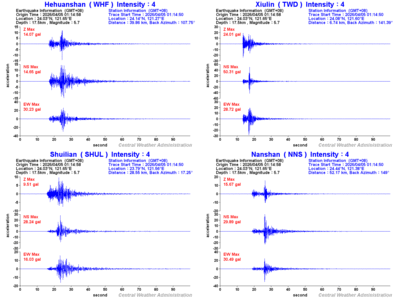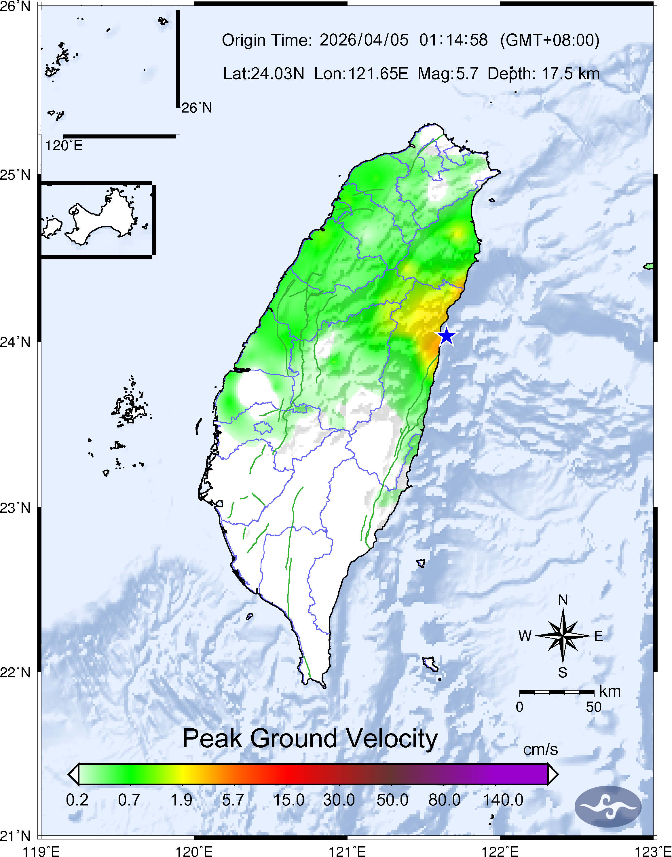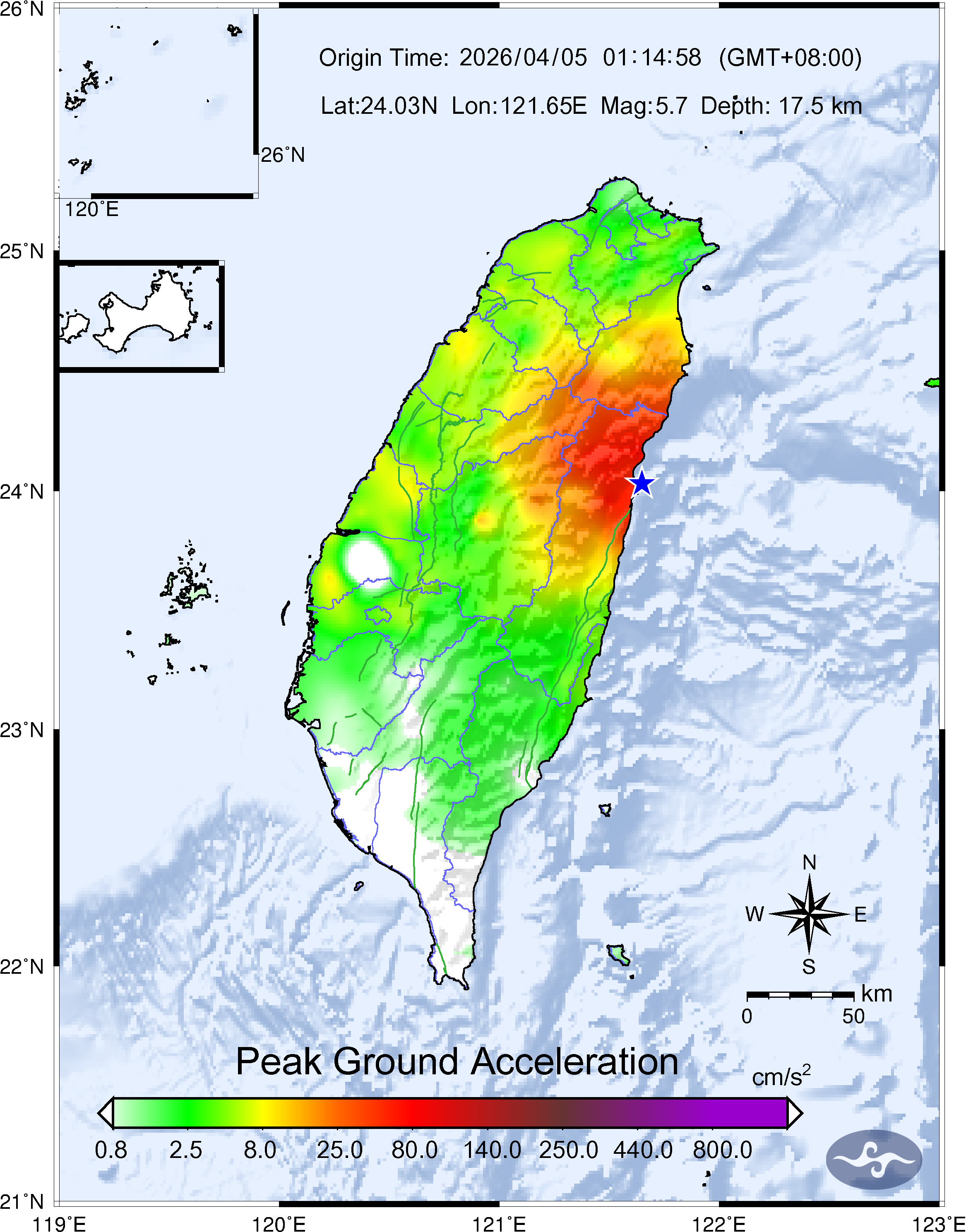 - Epicenter: 24.03°N, 121.65°E 5.4 km NNE of Hualien County Hall