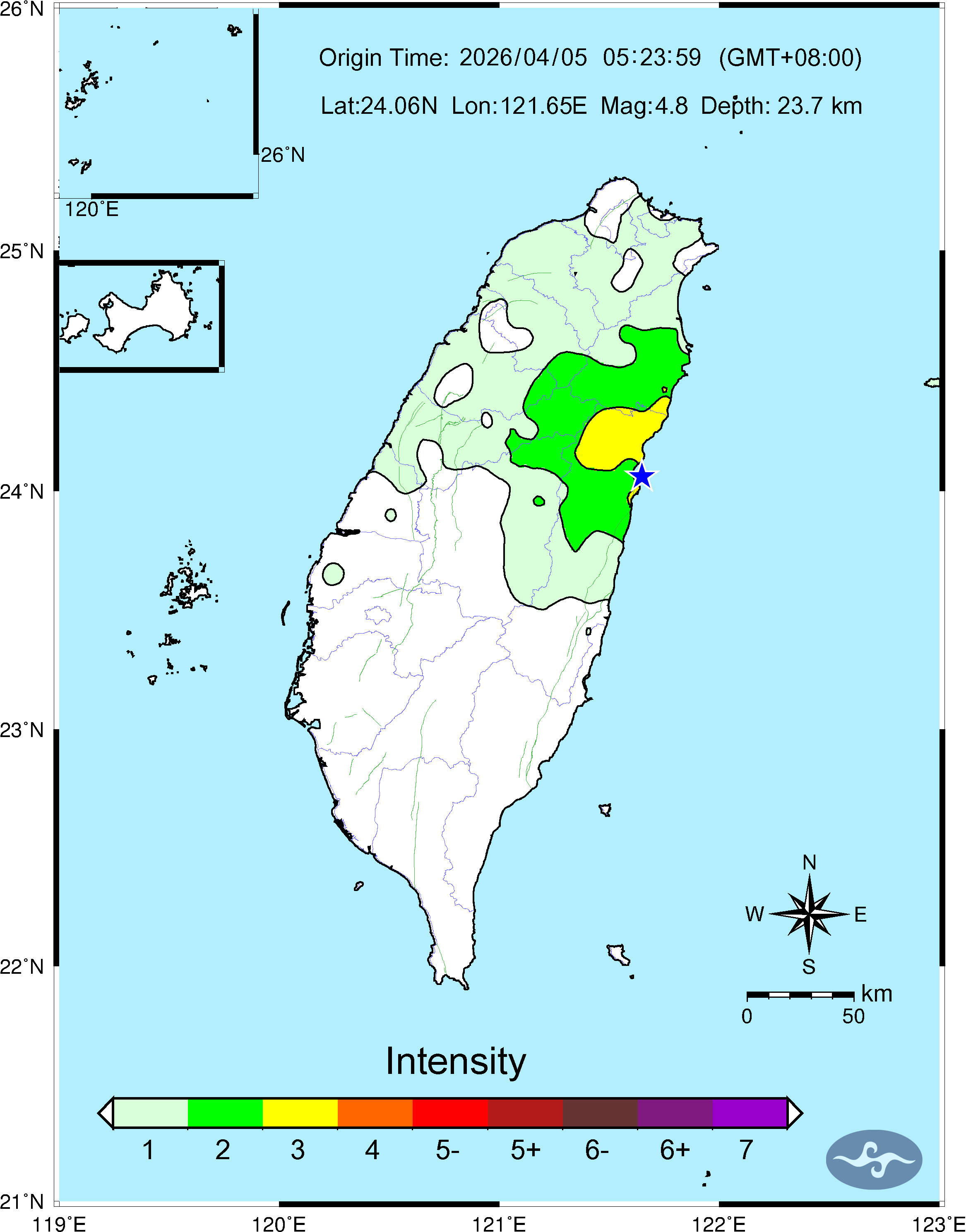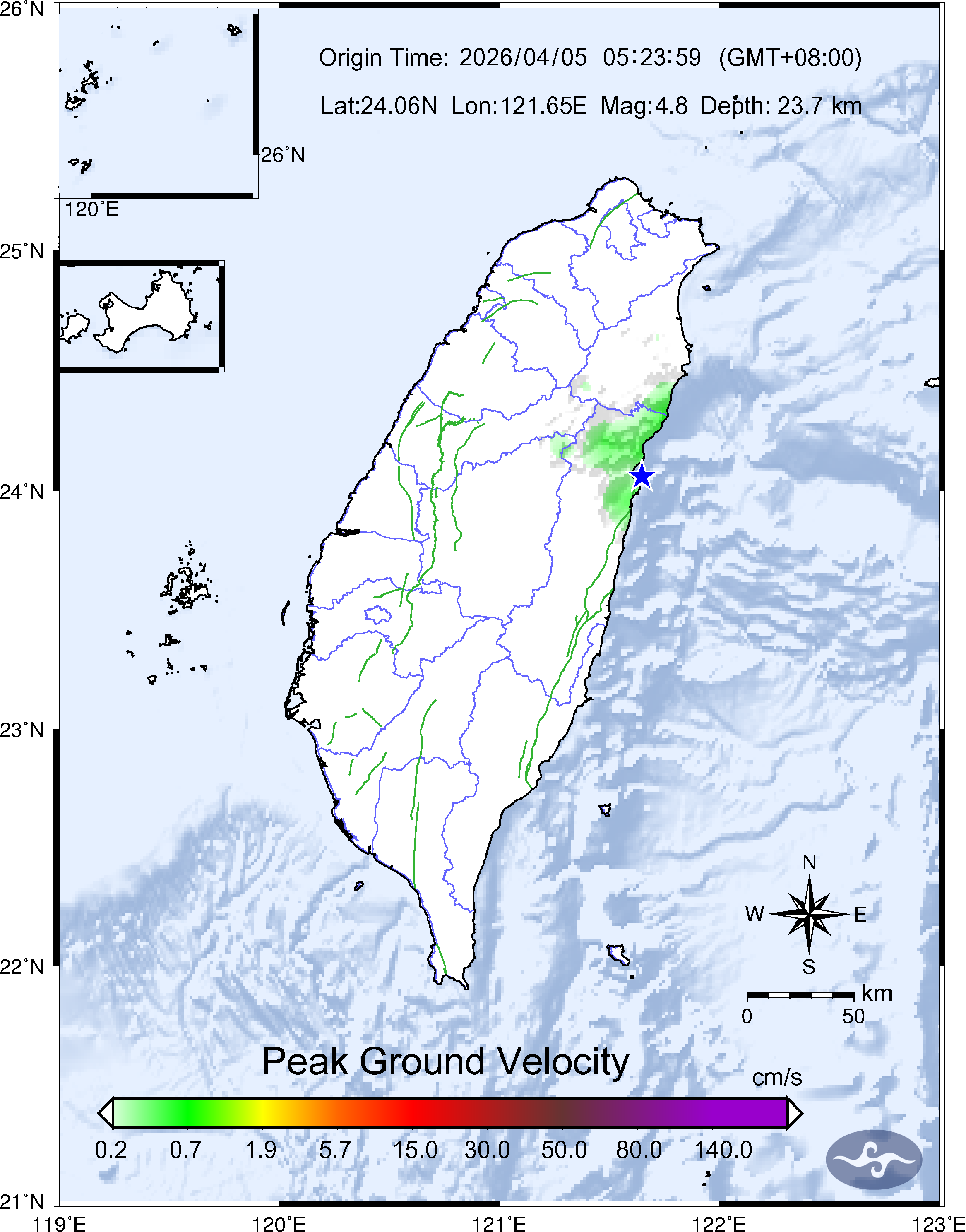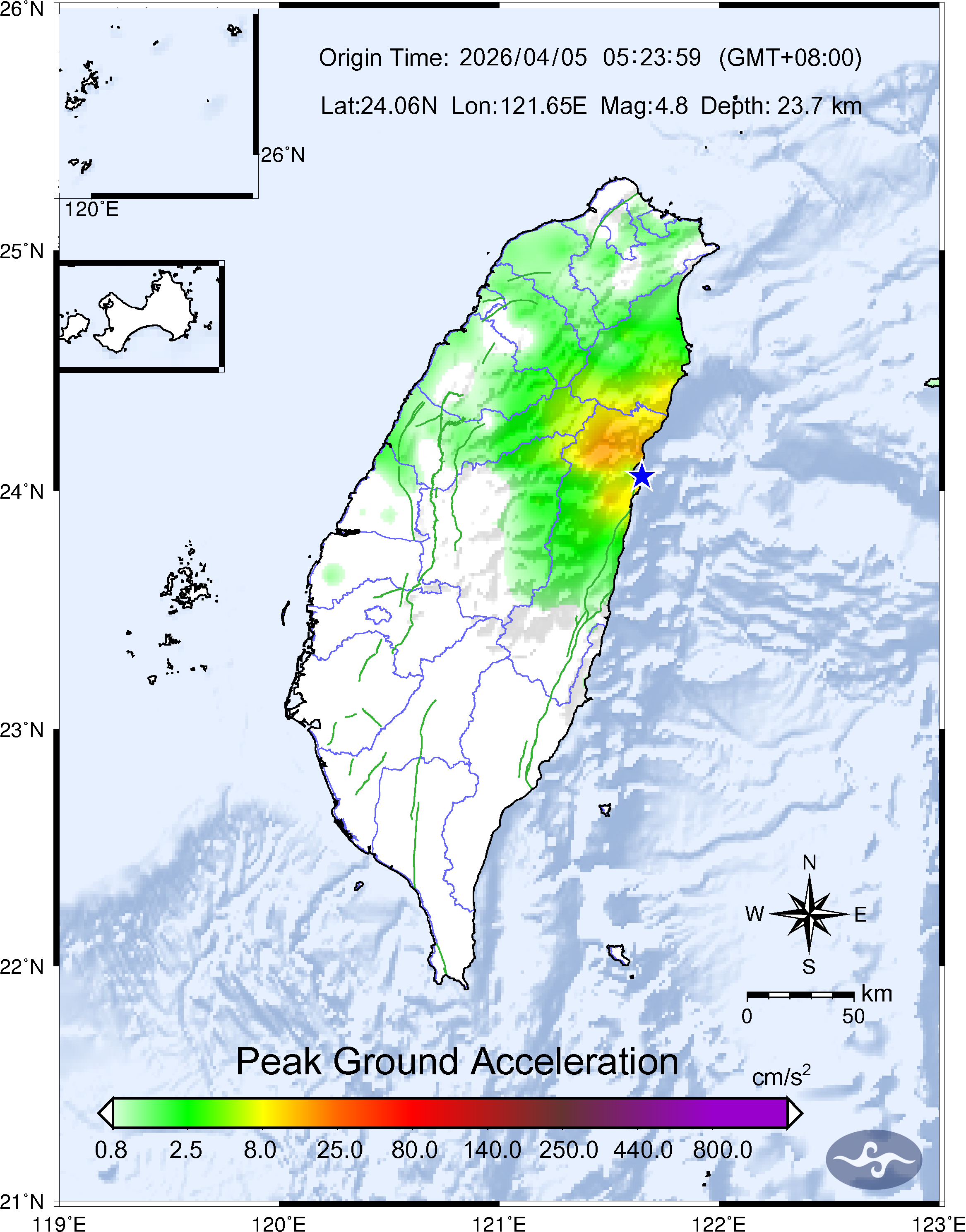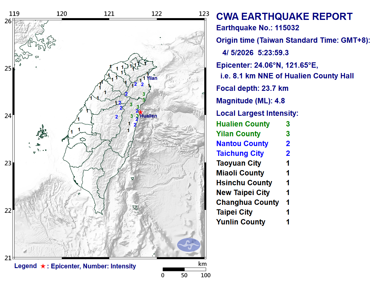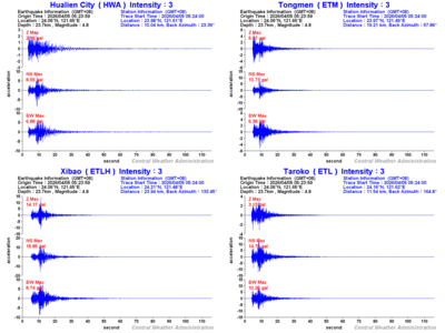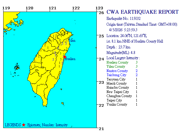 - Epicenter: 24.06°N, 121.65°E 8.1 km NNE of Hualien County Hall