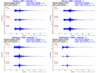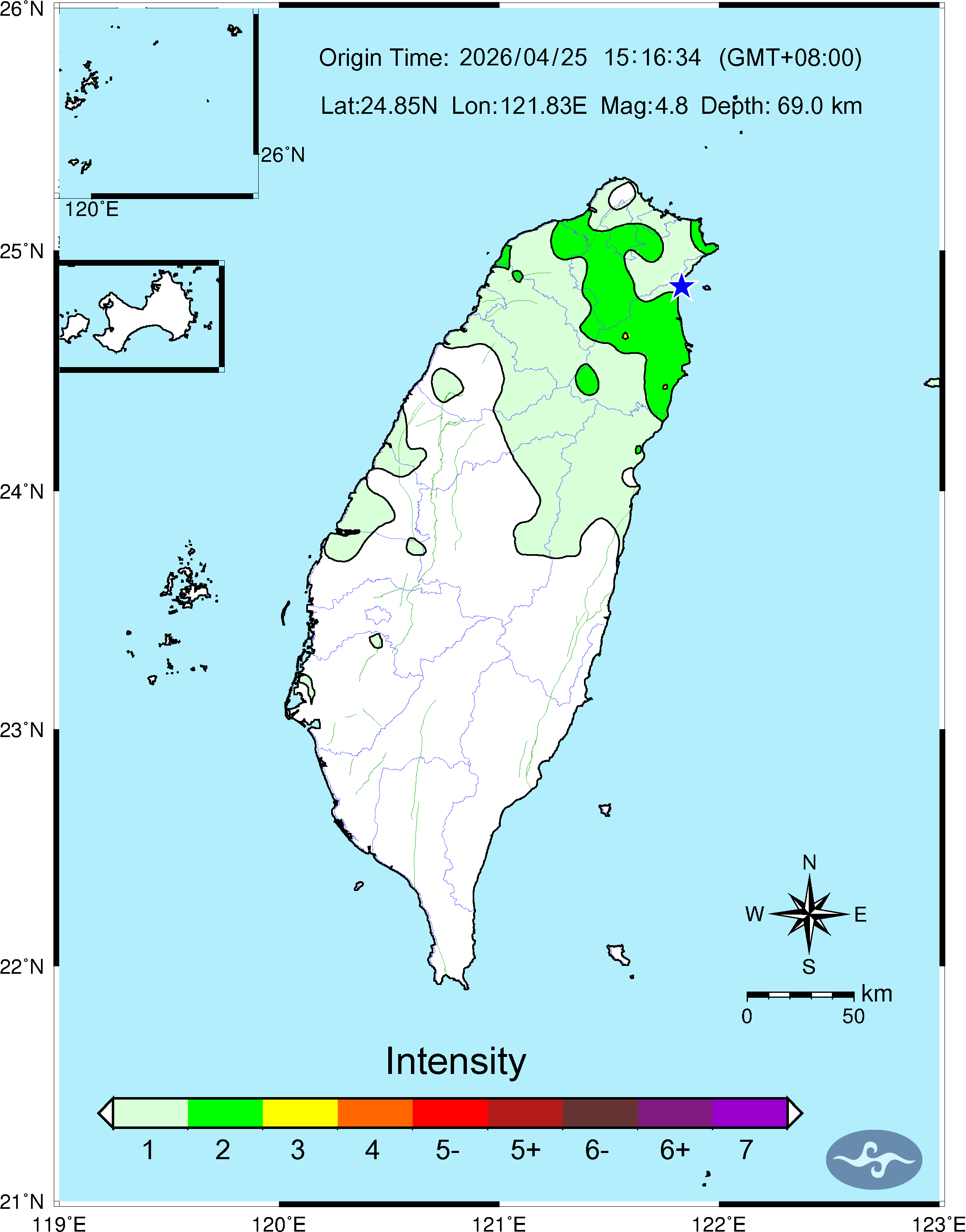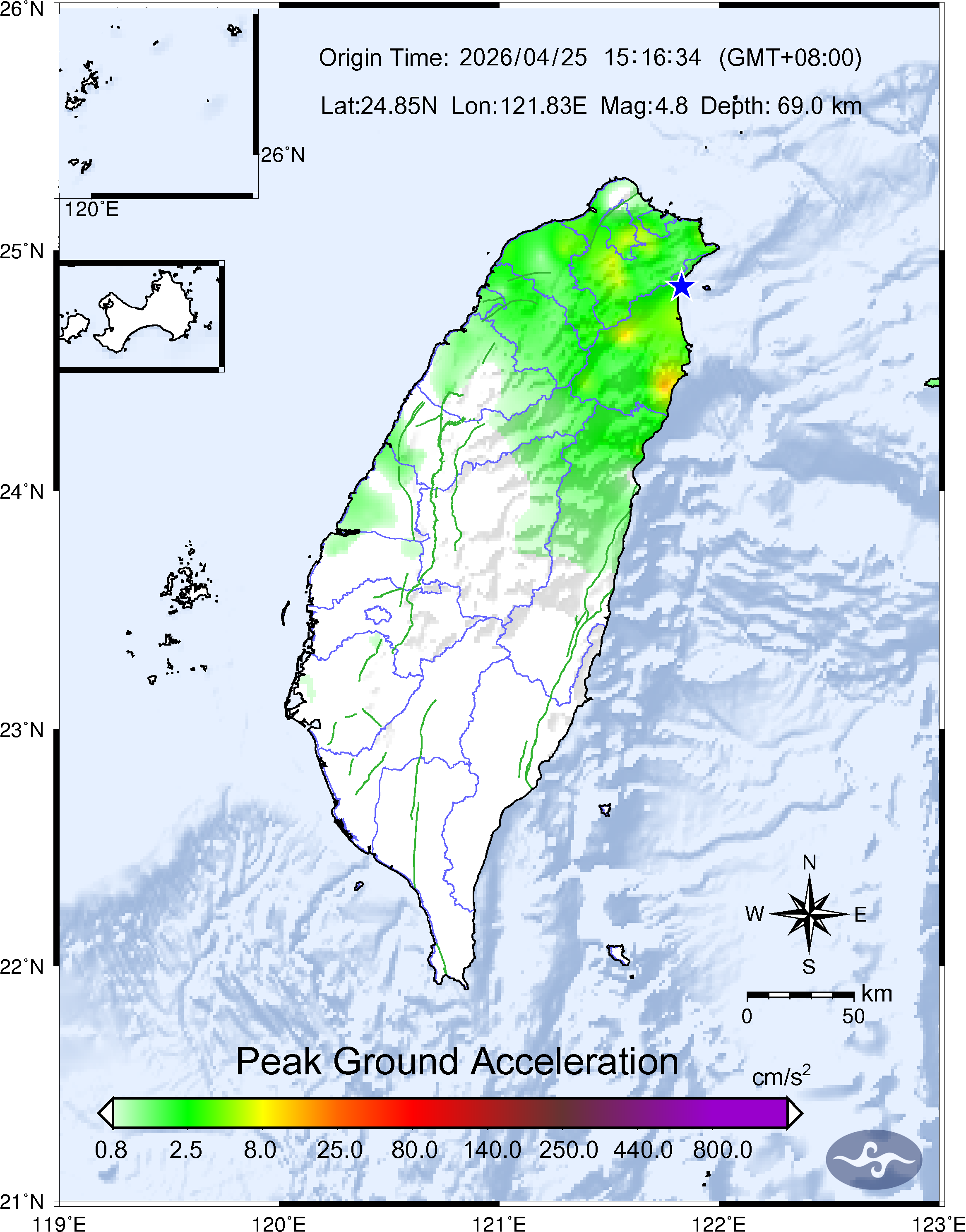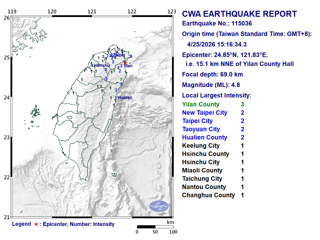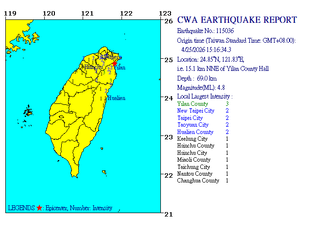 - Epicenter: 24.85°N, 121.83°E 15.1 km NNE of Yilan County Hall